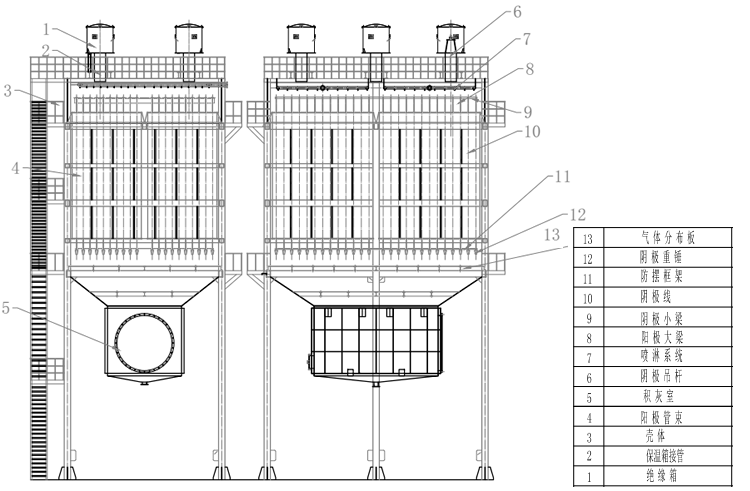 河北威美實(shí)際運(yùn)行的一組電除霧器示意圖,里面標(biāo)明了電除霧器的各部分組件,示意如下圖