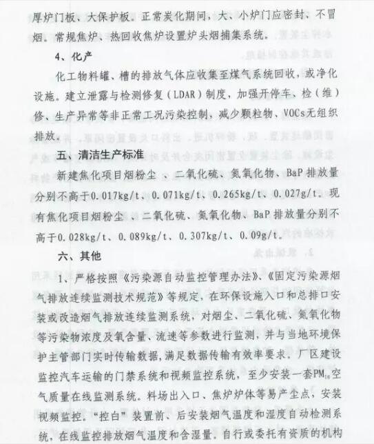 2018年9月底前,全市所有焦化企業(yè)全部達到超低排放水平(限值參照驗收標準,通過168小時運行且第三方監(jiān)測達標,95%以上小時均值排放達標),并完成濕煙氣脫白治理改造,凡達不到標準的實施停產整治