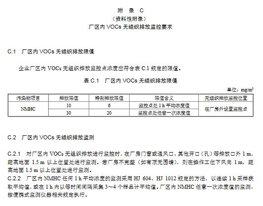5.8 企業(yè)廠區(qū)內(nèi)VOCs無組織排放監(jiān)控要求地方生態(tài)環(huán)境主管部門可根據(jù)當(dāng)?shù)丨h(huán)境保護(hù)需要,對廠區(qū)內(nèi)VOCs無組織排放狀況進(jìn)行監(jiān)控,具體實(shí)施方式由各地自行確定。廠區(qū)內(nèi)VOCs無組織排放監(jiān)控要求參見附錄C。