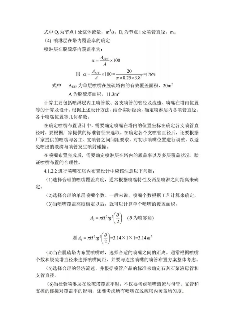 本脫硫工藝選用的吸收塔為噴淋塔,噴淋塔的尺寸設計包括噴淋塔的高度設計、噴淋塔的直徑設計