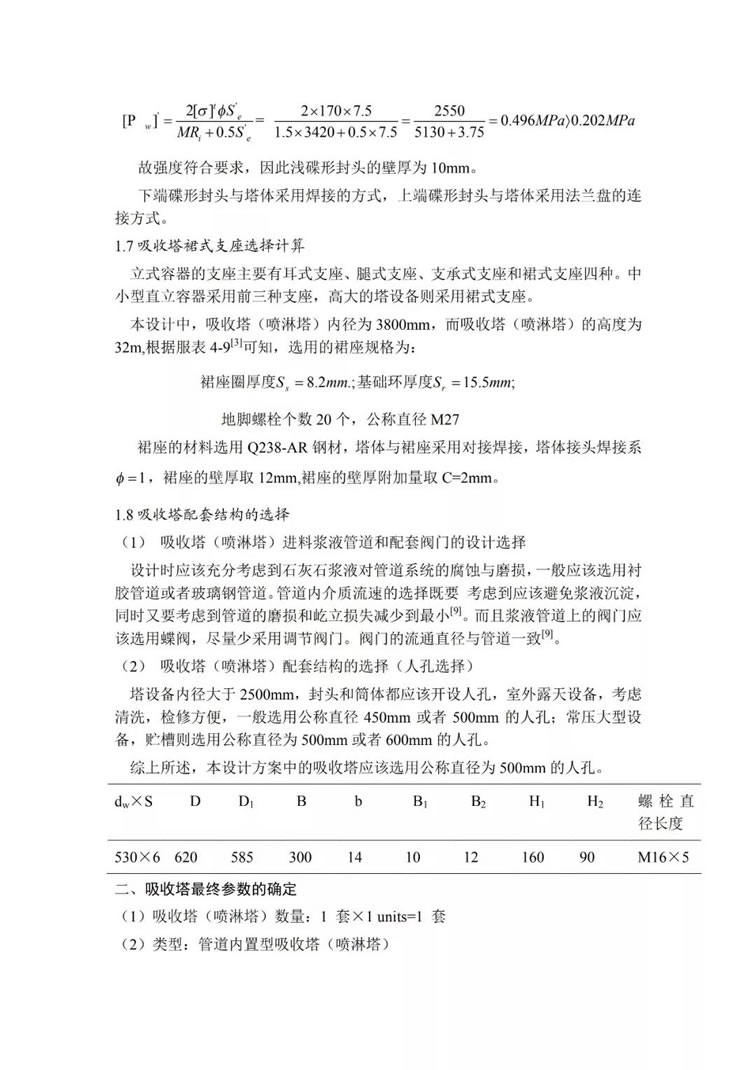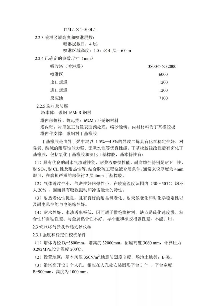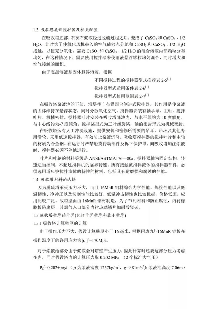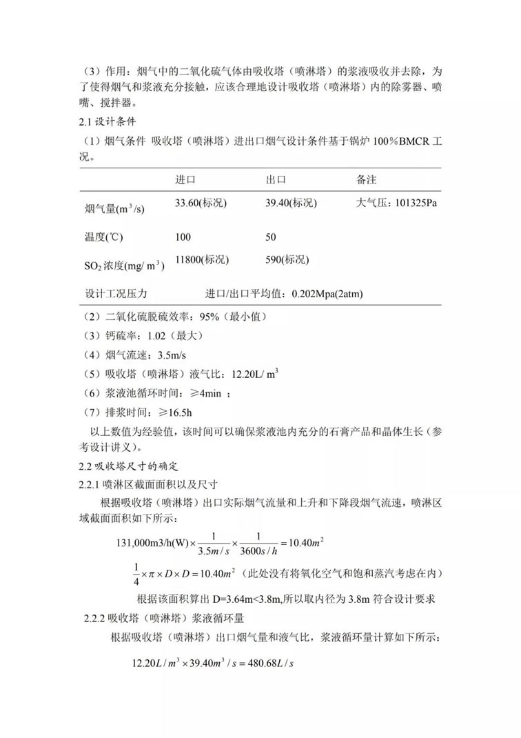吸收塔是脫硫裝置的核心,是利用石灰石和亞硫酸鈣來脫去煙氣中二氧化硫氣體的主要設備,要保證較高的脫硫效率,必須對吸收塔系統(tǒng)進行詳細的計算,包括吸收塔的尺寸設計,塔內(nèi)噴嘴的配置,吸收塔底部攪拌裝置的形式的選擇、吸收塔材料的選擇以及配套結(jié)構(gòu)的選擇(包括法蘭、人孔等)。